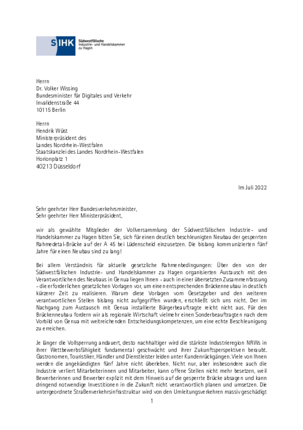wir als gewählte Mitglieder der Vollversammlung der Südwestfälischen Industrie- und Handelskammer zu Hagen bitten Sie, sich für einen deutlich beschleunigten Neubau der gesperrten Rahmedetal-Brücke auf der A 45 bei Lüdenscheid einzusetzen. Die bislang kommunizierten fünf Jahre für einen Neubau sind zu lang!